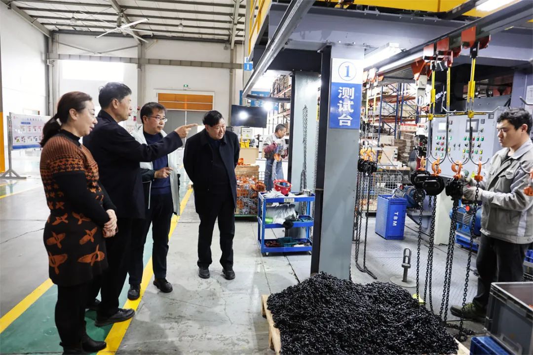 雙鳥集團張文忠董事長、盛嘉慶總經理陪同王會長一行參觀了雙鳥機械總裝車間、起重鏈條制造車間。