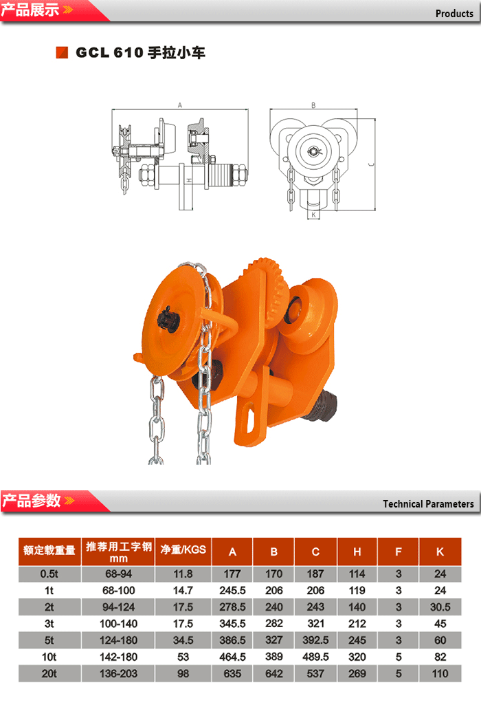GCL/GCT810系列小車選用了全新的高強度低合金結構鋼,確保4倍安全載荷,輕巧、安全、安裝方便、是目前最為輕巧小車之一。